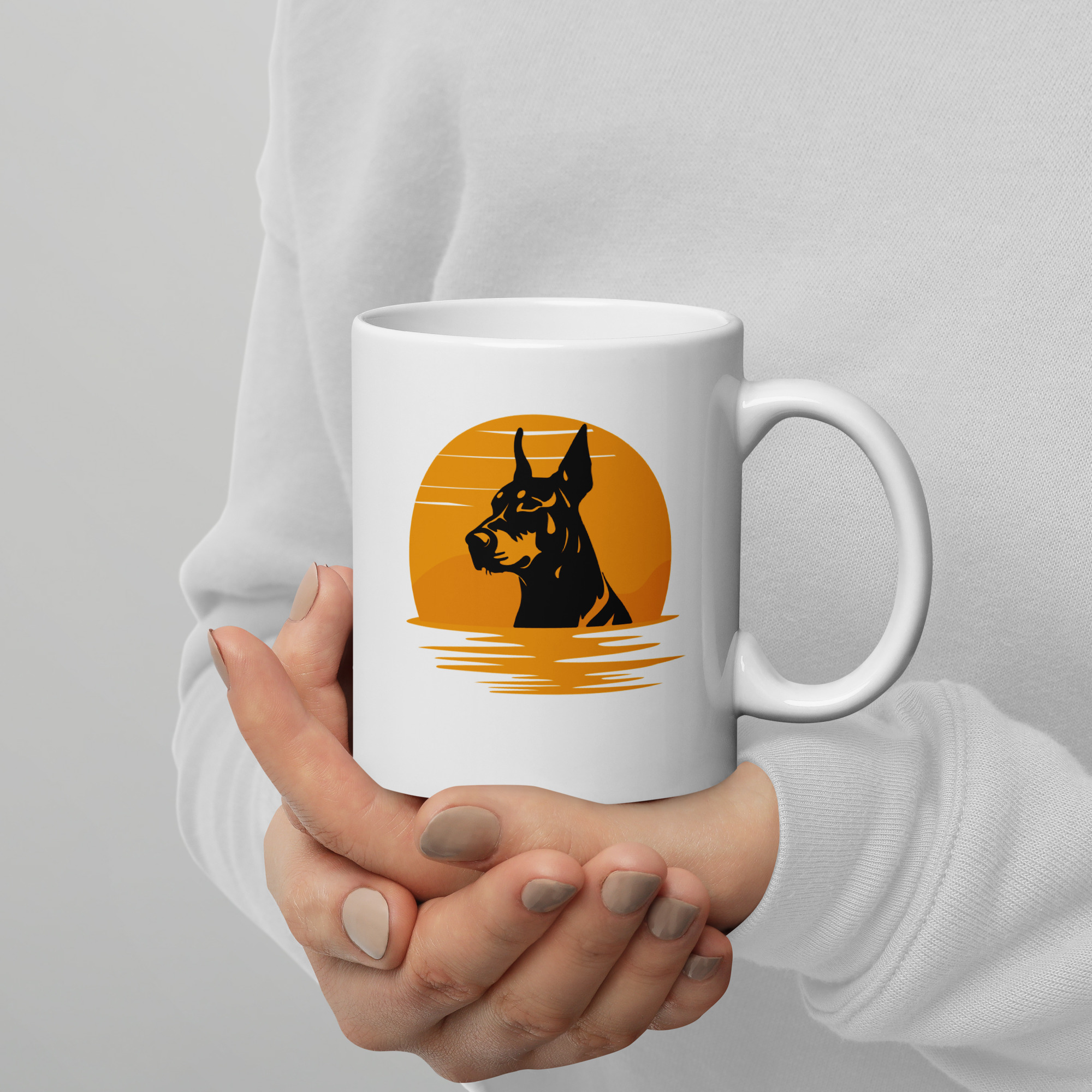 Tyyliä joka hörpyllä. Tämä valkoinen keramiikkamuki yhdistää dobermannin elegantin profiilin ja rauhallisen auringonlaskun värimaailman – selkeälinjainen design, joka sopii sekä kotiin että työpaikalle. Kiiltävä pinta ja laadukas painatus säilyvät upeina arjen käytössä.