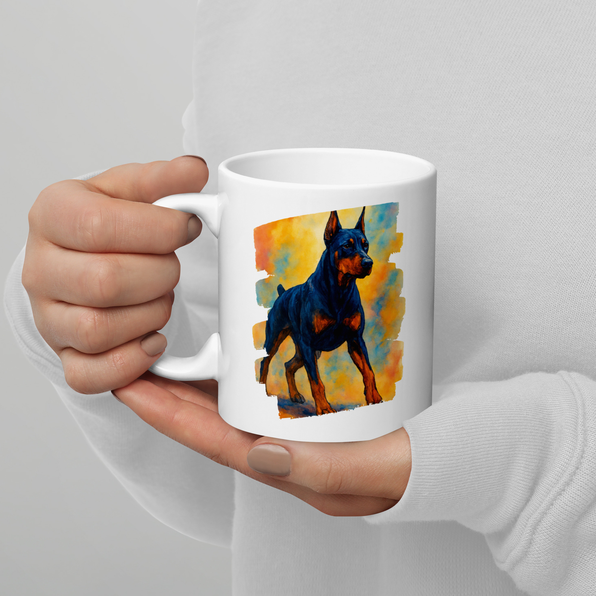 Nauti aamukahvisi tai iltateesi tyylillä tämän valkoisen mukin kanssa, jossa on upea ja tarkka Doberman-painatus. Muki on kestävä, kiiltäväpintainen ja suunniteltu säilyttämään näyttävän printtinsä sekä mikrossa että astianpesukoneessa.