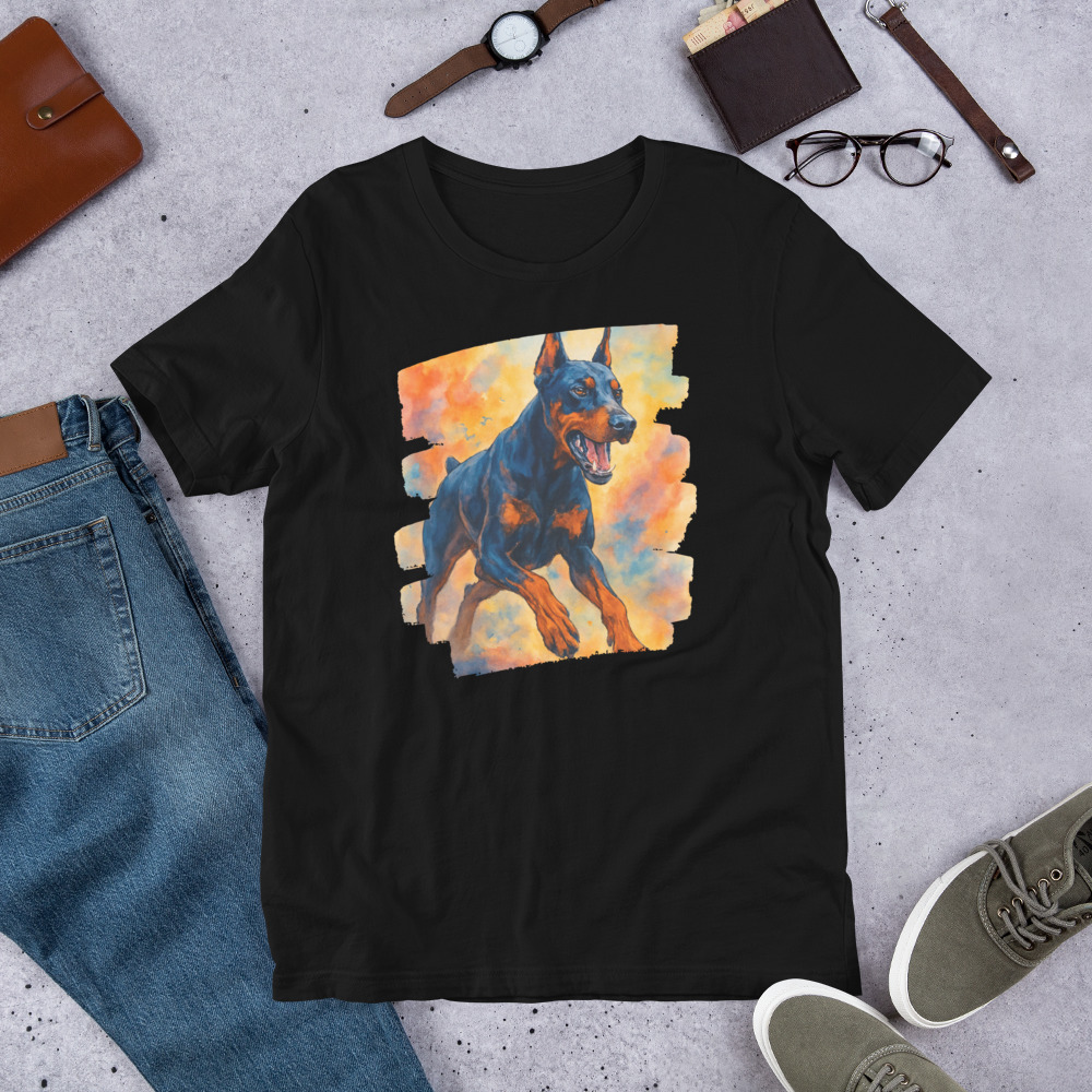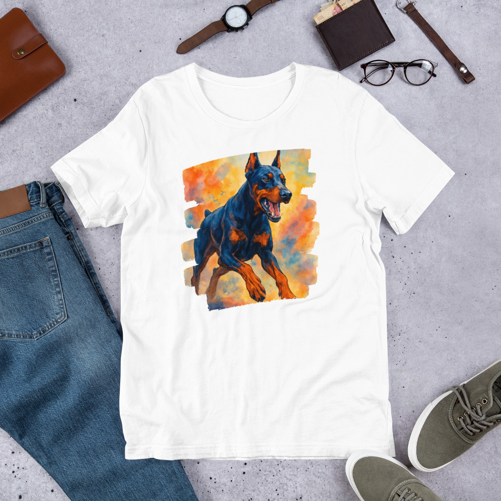 Tämä laadukas t-paita tuo esiin dobermannin voimakkaan ja atleettisen olemuksen näyttävän vesivärimäisen kuvituksen kautta. Kevyt, pehmeä ja sopivasti joustava paita tarjoaa huippumukavuutta ja kestää käyttöä päivästä toiseen – aivan kuten tämä rohkea ja elegantti koirarotu itsekin!